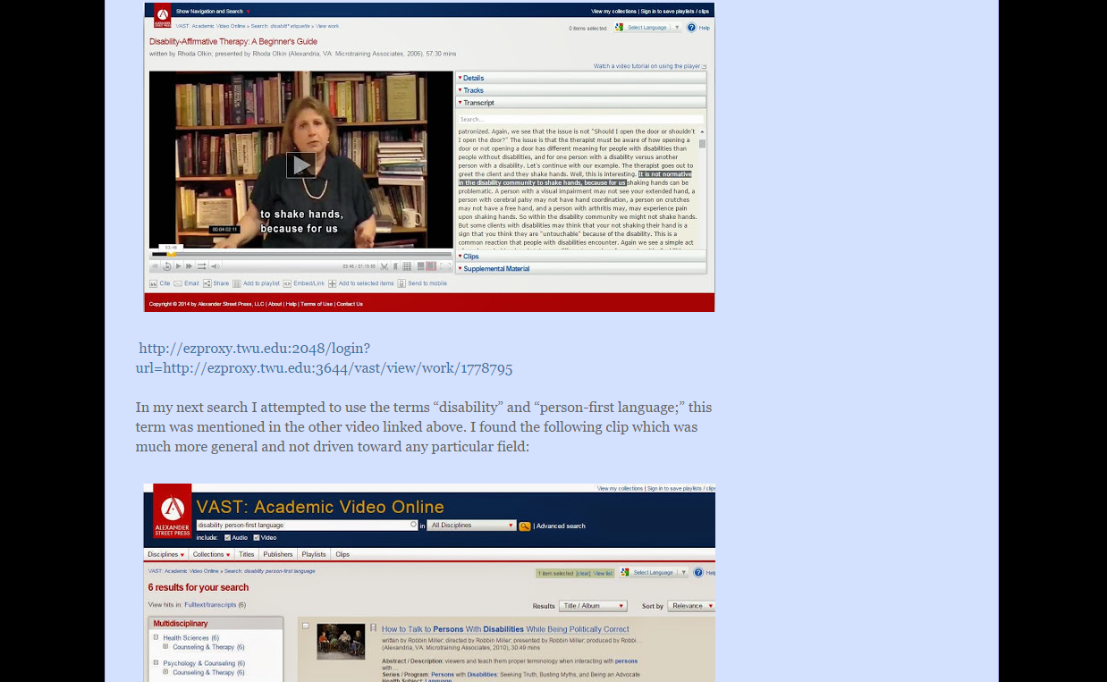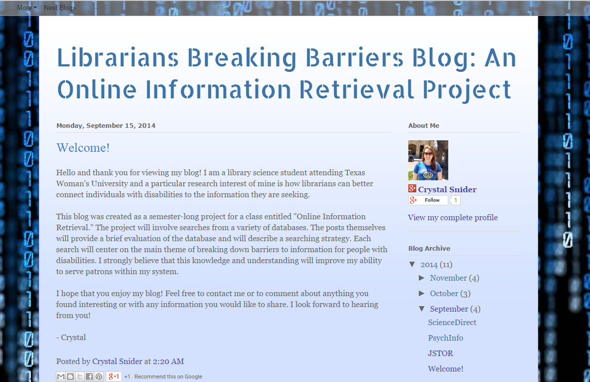 This project was created for LS 5513 "Online Information Retrieval." The course focused on learning search strategies for finding information on a variety of online databases. Students were asked to choose a central topic to base all of their searches on that closely related to libraries. For my particular project, I chose to focus on learning more about the Americans with Disabilities Act and how libraries can more effectively serve patrons with disabilities and "break down barriers" to information.